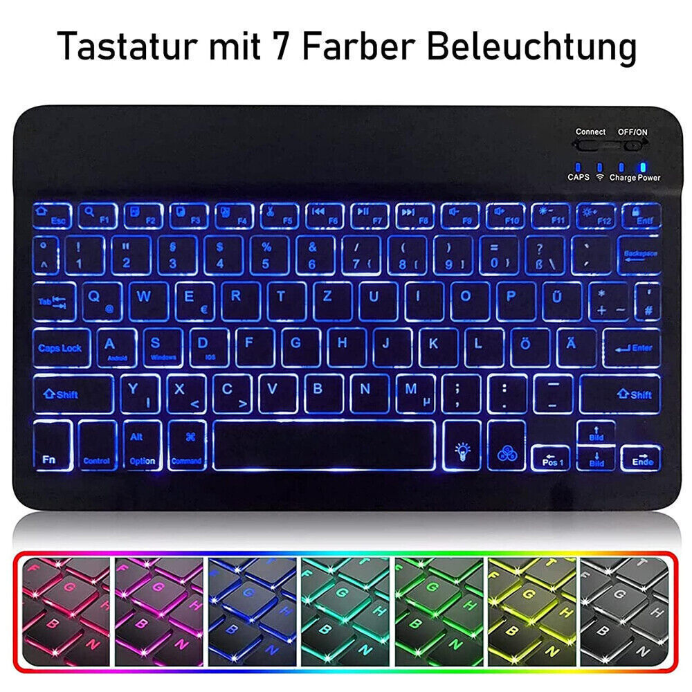 Die Reichweite beträgt bis zu 10m/33ft. RGB QWERTZ Tastatur mit Hintergrundbeleuchtung. Bluetooth-Maus und -Tastatur können gleichzeitig mit dem iPad verbunden werden. #1 RGB Beleuchtet Tastatur. 1 Stk.Bluetooth-Tastatur.