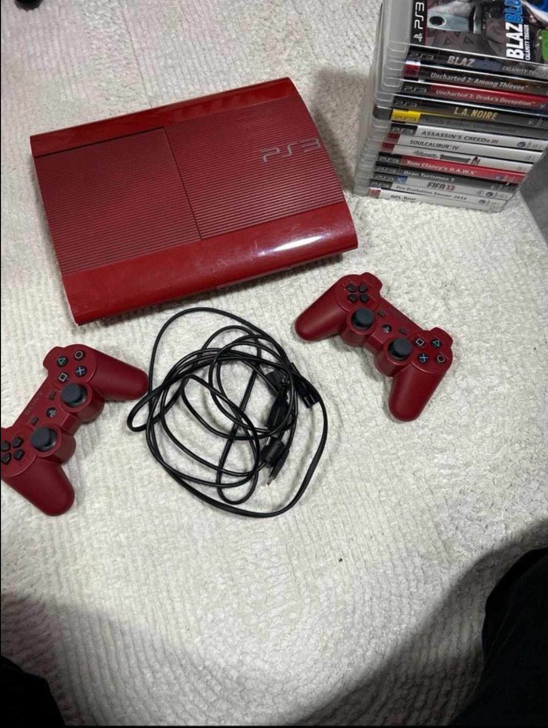 Biete eine Rote Playstation 3 Super Slim in einem guten gebrauchten Zustand an. Dazu gibt es 2 Controller und 13 Spiele ( Siehe Bild 2)