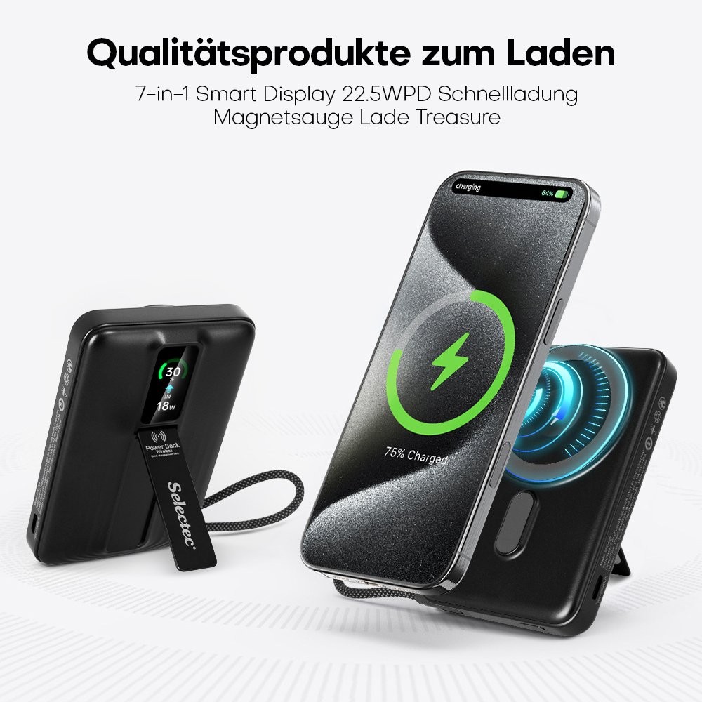 Beschreibung: Neues Update Wireless Quick Charging: Wireless Magnetic Powerbank ist kompatibel mit iPhone 12/13/14/15/16 Serie. Kabellose Schnellladung bis zu 22.5W. Es unterstützt auch USB-A 22.5W/USB-C 20W kabelgebundene Ausgabe. Sowohl kabelgebundenes als auch kabelloses Laden können gleichzeitig durchgeführt werden. Dank der ausgezeichneten magnetischen Ladeeffizienz bietet es Ihnen ein komfortables Ladeerlebnis. Hinweis: Das kabellose Aufladen funktioniert nur, wenn kein Gehäuse oder ein magsicheres Gehäuse vorhanden ist. .