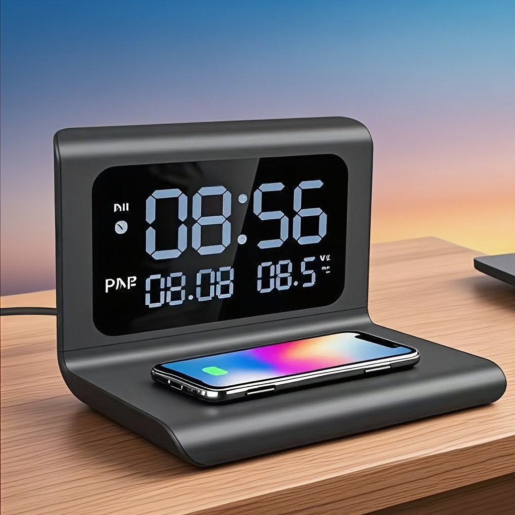 Funktionen: - Mit der mitgelieferten Ladestation können Sie Ihr Smartphone bequem aufladen, ohne es zu vergessen. - Unterstützt adaptives Laden mit 5 W/7,5 W/10 W/15 W und ist kompatibel mit iPhone 17/16/15/14/13/12/11/SE/XR/X, Samsung Galaxy/Note, Pixel 8/7/6-Serie, LG G8/7 und weiteren Smartphones. Es ist mit allen Smartphones kompatibel, die kabelloses Laden unterstützen. - Die Zeitanzeige ist klar und gut lesbar und zeigt zusätzlich die aktuelle Temperatur an – für ein komfortables Nutzererlebnis. - Einfache Bedienung: Zum Ein- und Ausschalten des Bildschirms drücken Sie einfach den „Power“-Knopf. .