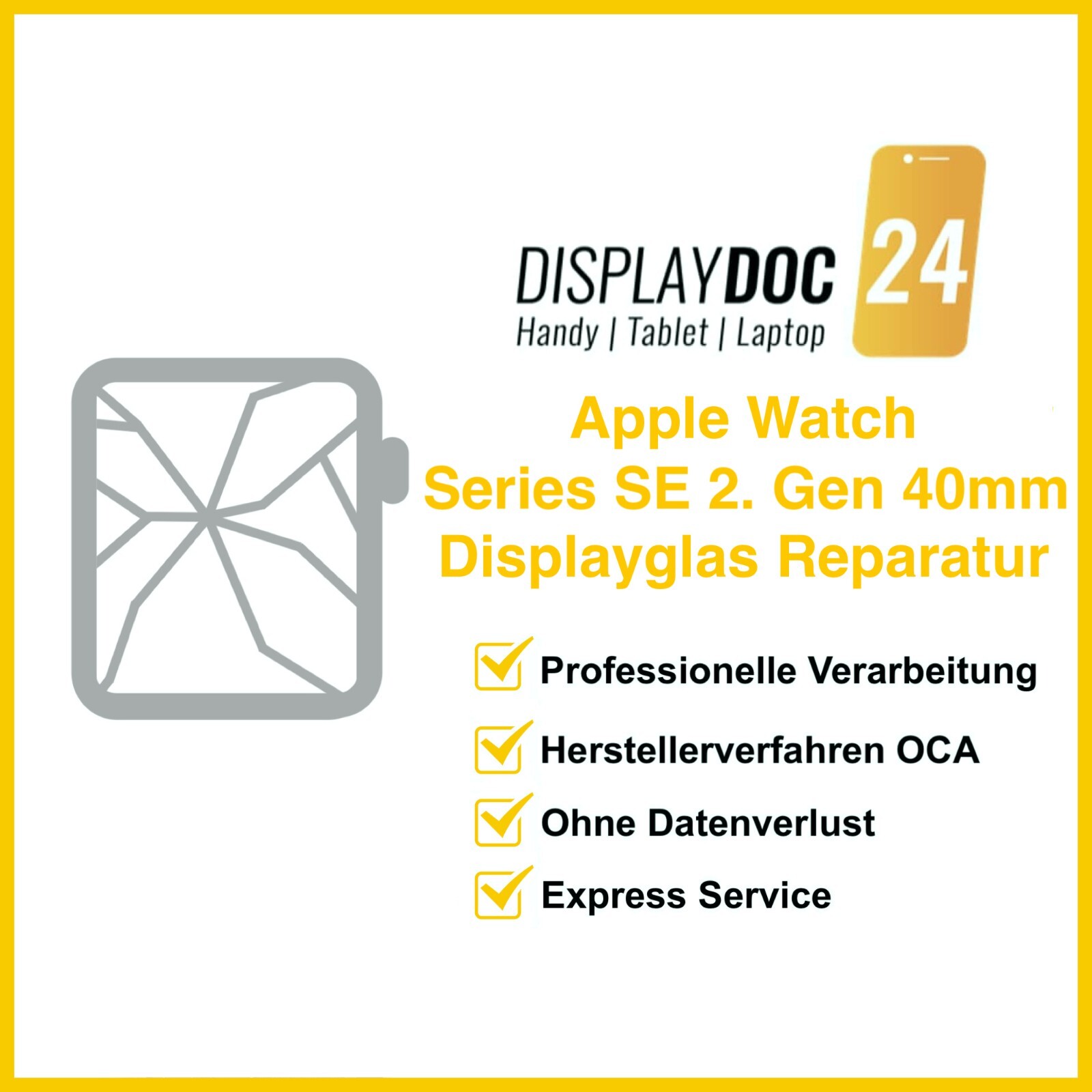 Ihre Apple Watch SE 2 40mm hat einen Sprung oder Riss im Displayglas, das Display ist aber noch in Takt?. ↔️ Displayglas / Frontglas tauschen. Für den Austausch des Displayglas muss das originale Apple Watch Display noch im Gerät verbaut und voll funktionsfähig sein.