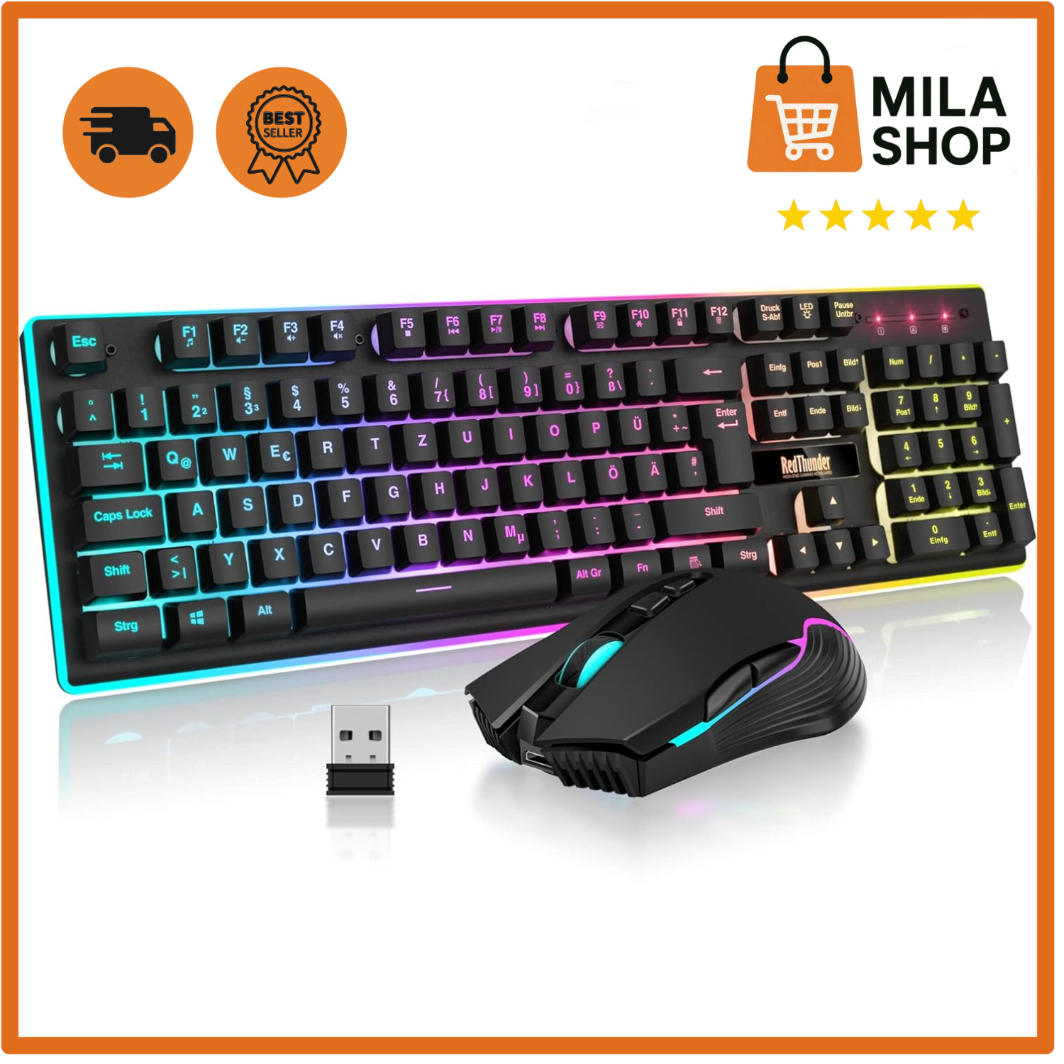 Mit einer stabilen 2,4-G-Verbindung und einer langen Akkulaufzeit ist sie ideal für intensives Gaming und tägliche Nutzung. 1x RedThunder K10 kabellose Gaming-Tastatur und -Maus-Kombination 1x USB-Empfänger.