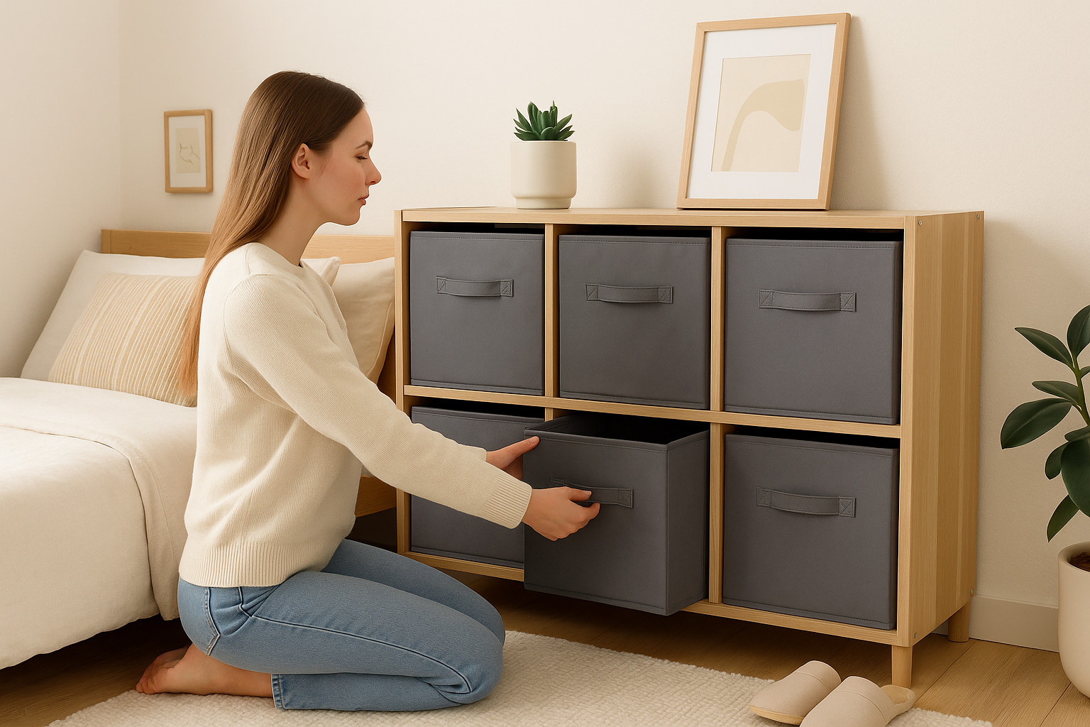 Approx size: 28 x 28 x 28 cm – fits most standard cube shelving units. Fits most standard cube shelving units. Fits standard cube shelving units. Foldable: Yes. Khaki – warm natural tone. Strong structure – holds shape when filled.