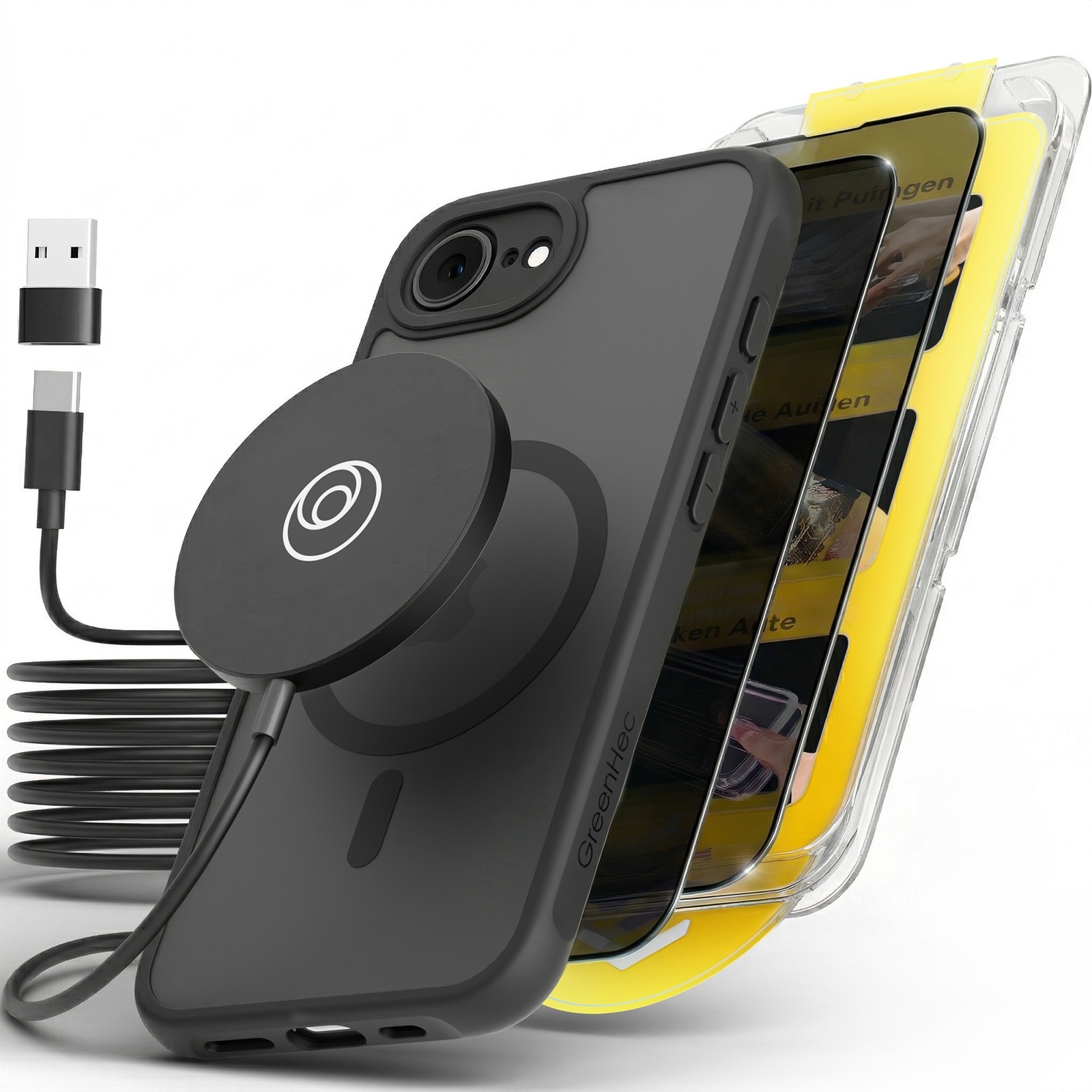 Frosted Black MagSafe Case – für iPhone 17e / 16e. Wähle flexibel dein Setup:nur Case ,Case + Crystal Glas ,Case + Privacy Glas oder direkt daskomplette Schutz-Bundle mit MagSafe Zubehör. 1x Hülle + Privacy Glas + MagSafe – All-in-One Schutz + diskrete Nutzung.