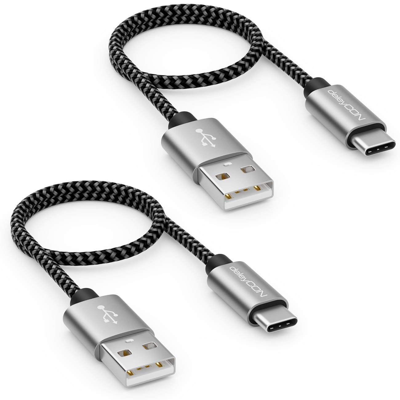 Hochwertiges USB-C Kabel Set für schnelles Laden und Datentransfer. Das Set beinhaltet zwei kurze Kabel mit jeweils 0,30 m (30 cm) Länge und robuster Nylonummantelung. Die Stecker sind aus robustem Metall gefertigt und sorgen für präzise Verbindungen. Diese Kabel sind ideal zum Aufladen von Mobiltelefonen, Smartphones, Tablets, Kameras, Navigationsgeräten und vielen anderen USB-C Geräten. Die Datenübertragung erfolgt mit bis zu 480 Mbit/s und die Ladegeschwindigkeit unterstützt bis zu 2 Ampere. Merkmale: - Set: 2 x 0,3 m (30cm) kurze USB-C Kabel - Robustes Nylonkabel mit hochwertigen Metallsteckern - Zum Laden und Synchronisieren von USB-C Geräten - Datenübertragung bis 480 Mbit/s - Kompatibel mit vielen Smartphones, Tablets uvm.